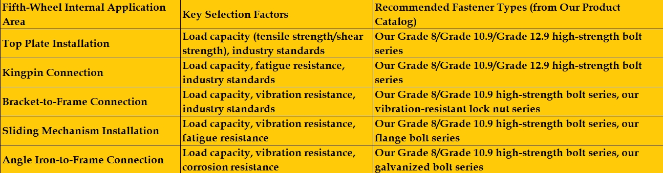 Viidennen pyörän järjestelmä altistetaan usein ankarille ympäristöolosuhteille, mukaan lukien sade, lumi, tiesuola ja muut syövyttävät aineet. Kiinnittimien valitseminen, jolla on riittävä korroosionkestävyys, on ratkaisevan tärkeää pitkäaikaisen suorituskyvyn ja turvallisuuden varmistamiseksi. Sovelluksissa, joissa korroosio on merkittävä huolenaihe, suosittelemme kiinnittimien käyttöä, joilla on korroosioiden kestäviä pinnoitteita (kuten galvanoituja, kuumia galvanoituja) ja ruostumattomasta teräksestä valmistettuja.